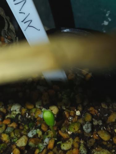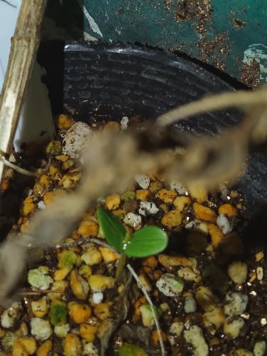 昨秋とれた実の種は二つだけ発芽。うちひとつは、種の殻をかぶっていて心配だったので爪でかいていたが、なんとか外せた。