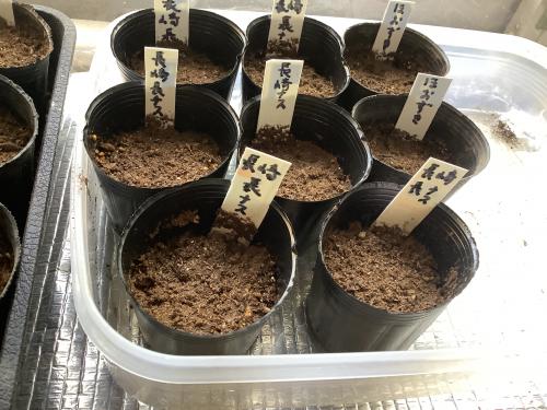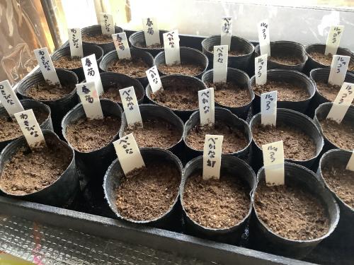 長崎長茄子 わさび菜 ルッコラ 春菊 食用ほおずき みやこべか菜 の6種蒔きました。 わさび菜とルッコラは去年の秋蒔きの株が菌ちゃん畝で元気に育っていますが、美味しいので春からも続けたくて蒔きました。