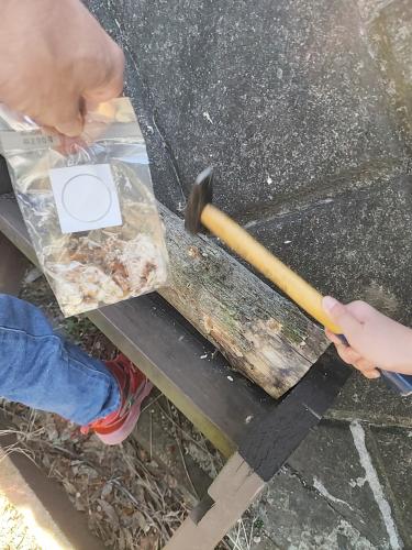 2023年の夏に伐採した雑木(ネズミモチ)ですが、丸太にしいたけの菌を打ち込みしました。 雑木ですが、しいたけができるかチャレンジします。 ほだ木は、いちじくの木の下に置きます。 定期的に水分を補充します。