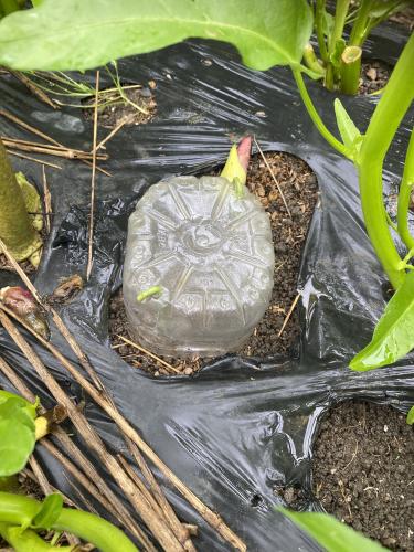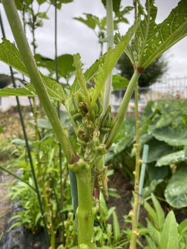 使用薬剤「アリカダン」をオクラの株元に置いて、