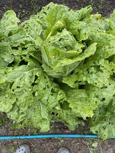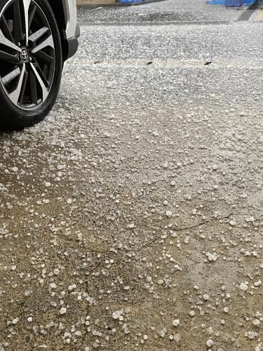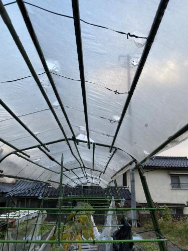 大きな雹が降ってビックリでした!!! ガレージの屋根板が壊れるのでは、、、というほど大粒! 気になって畑に行ってみると、 ブドウの屋根ビニールに多くの破損穴がありました。 、、、張り替え修復が必要です 白菜など多くの野菜も被害受けてました。