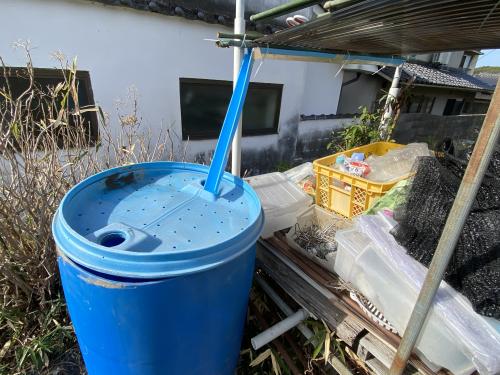 訳あって年始から毎日水道水を運搬していたが、 雨水を利用する方法に変更して水運搬の手間を省きました。 道具置き場の屋根を活用して、 雨水が自動的に貯水タンクに溜まるようにしました。 これも渇水が続くようなら困りもんですが(^。^);