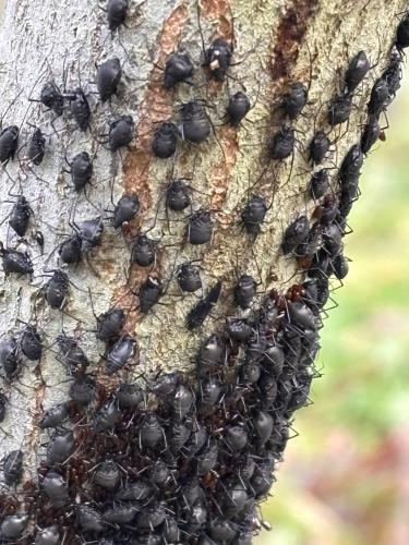 12月9日 冬の到来でアブラムシ集団で集まっている マイナス5度でアブラムシは死ぬというが卵は残るよう。 殺虫剤をスプレーした。 後日中にある卵がどうなっているか要確認