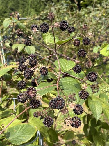 ウドの花はミツバチが大好き 2025年8月17日 開花している 去年は黄色スズメバチが盛んにウドの蜜を吸っていたが、今年は全く来ていない。 全滅しているのかなあ。 2025年10月3日 花が先終わり種ができ出した