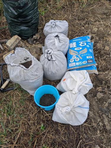 砂、小粒の軽石、人糞堆肥色々持ち込んで土壌改良と思いましたが… 雨の後で土が重い… 粘土質なんか特に。ベタベタするし 苦笑 土の様子を見ながらまくまではしたけれど、土が重くて撹拌まで出来たのは全体の1/4 …コツコツ続けます