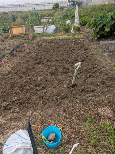 やっと土っぽくなってはきてるけど、掘るとまた粘土…シャベルで切って砂と混ぜて…