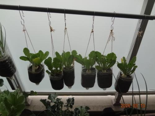 小太りくん、播種105日目、収穫しました。2期作で寒冷期の栽培、日数は十分でも予想以上に小さかった。ペットボトル左から順に、播種84日目、91日、91日、95日、103日、105日の6株です。