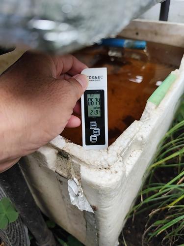 水耕栽培しているブロッコリーの葉の色が薄いです。 液体肥料の濃度を測りました。 EC計は、本日新しいものを使います。 液体肥料が薄いので、液体肥料を足しました。