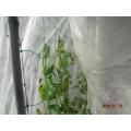 スナップ、播種22日目の様子。枯れ枝の支えを超えるので、早速、誘引ネットをつけました。