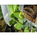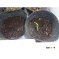 スナップ、播種8日目の様子。30粒埋めて、発芽は12粒。種が古いのと、プラ鉢によって差があり、土の水分の多さと深く埋めたのが原因で、酸欠になったと思われる。ウスイエンドウ、発芽はわずか1粒でした。