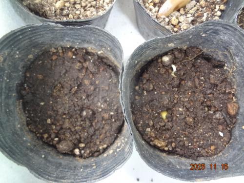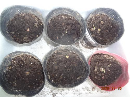 スナップ、播種4日目の様子。どのプラ鉢も発芽しているようです。ウスイエンドウも発芽しているようです。