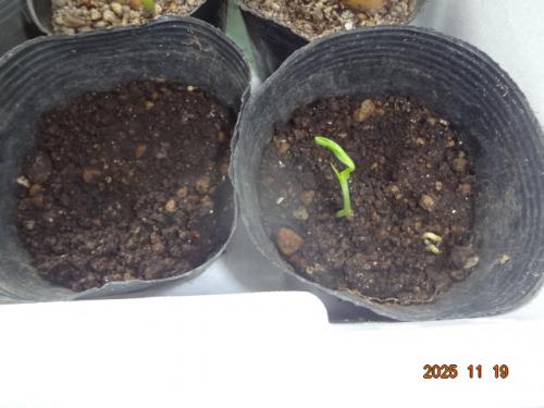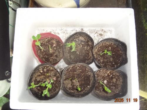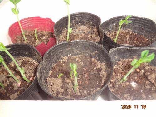 スナップ、播種8日目の様子。30粒埋めて、発芽は12粒。種が古いのと、プラ鉢によって差があり、土の水分の多さと深く埋めたのが原因で、酸欠になったと思われる。ウスイエンドウ、発芽はわずか1粒でした。