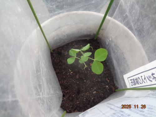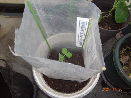 ウスイエンドウ、播種15日目、定植しました。1株、鉢に移しました。風よけを設置しました。