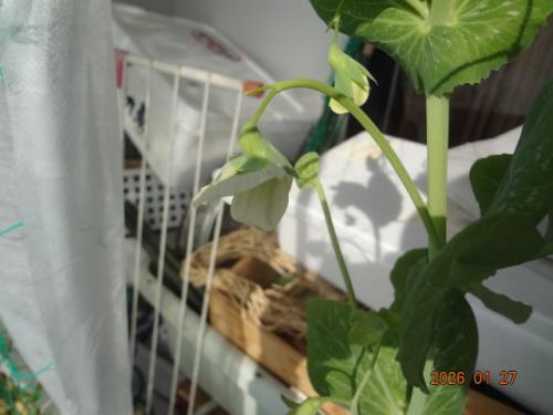 スナップ、播種77日目の様子。もう果実を発見しました。不織布で暖かいのか白い花が増えてます。