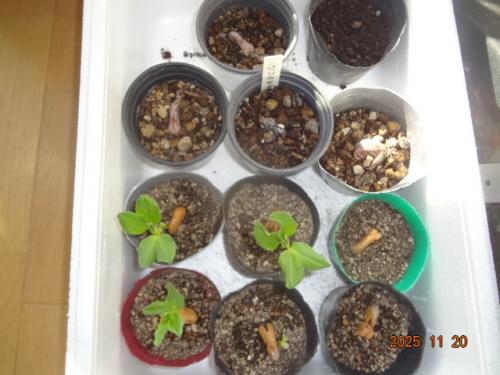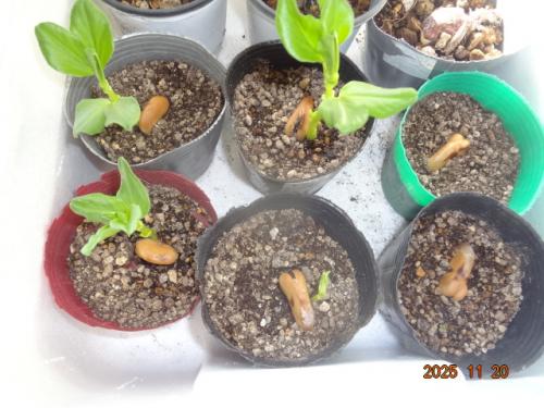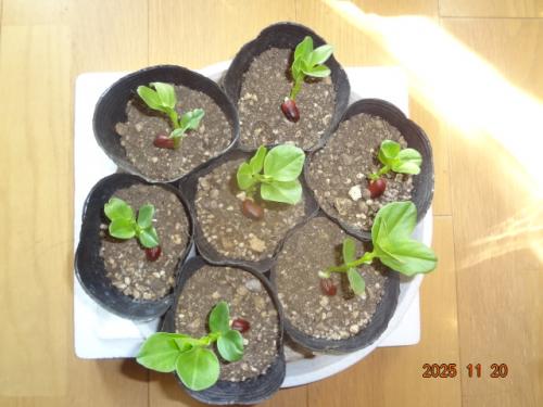 ソラマメ、播種14日目の様子。赤ソラマメは7粒すべて発芽、一寸そら豆は10粒のうち4粒が発芽しました。リビングで育苗中ですが、光を当てないと徒長しそうです。