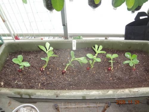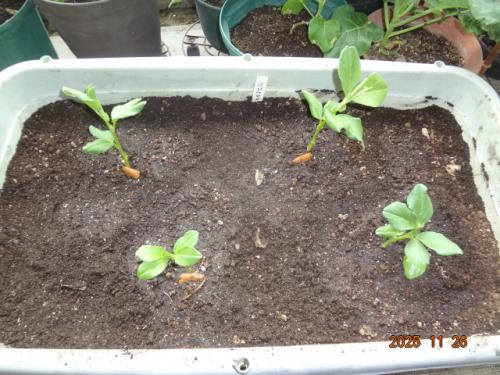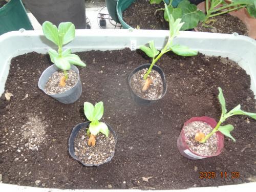 ソラマメ、播種20日目、定植しました。赤ソラマメ6株、一寸そら豆4株、定植しました。枯草で根元の防寒をします。