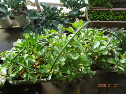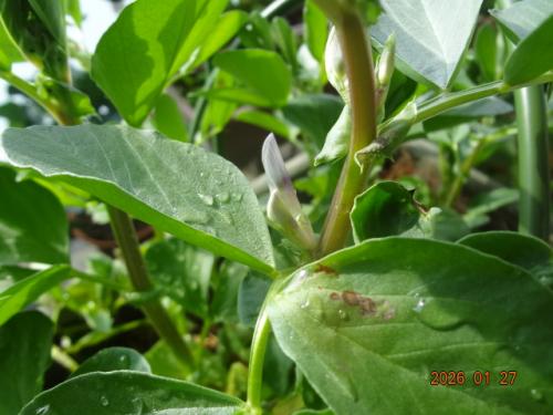 ソラマメ、播種82日目の様子。赤ソラマメにもう花芽を発見しました。不織布の保温のせいかもしれません。