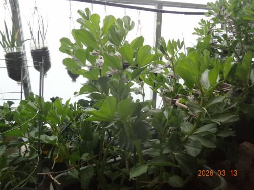 ソラマメ、播種127日目の様子。赤ソラマメは満開で莢が見えます。一寸そら豆は背丈80㎝です。