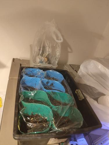 フラガール(ミニトマト)の種まきをしました。 赤6粒 オレンジ4粒 ポットを冷蔵庫の上に置きます。 乾燥防止のため、ラップをかけました。