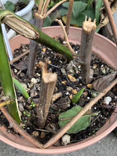 ちゃんと咲くのかは難しいように思える。肥料は置いたが、鉢の上部にのみなので、思ったよりは効かないはず。鉢に色々枯れ枝をさしてるのは、ねこがふんをするかもしれないため。