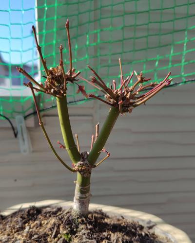 ベランダのモミジが葉を落としたので そろそろ枝を整理したい。 もう葉芽が動き始めてる。 どうしたいのか 作りたい姿がわかっていないのでどこを剪定したらいいのか悩み中。 いろんなサイトを見たり、いろんなモミジの樹形を見たり これって 枝をのばして樹形を作るんだよね。 とか マジ悩み中。