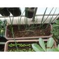 泉州黄玉、播種43日目、定植しました。まだ幼い苗ですが、プランターに10株、密植です。第1弾です。
