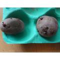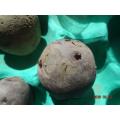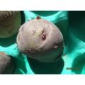 レッドムーン、肥大せずに収穫。4月20日に地表に芽が出て57日目、2株で15個ほど塊茎がありましたが、3㎝未満でした。花芽が盛んで生殖成長して力尽き、さらに栄養成長する前に枯れたようです。芽が出るのが例年より遅い親芋だったかな。