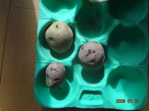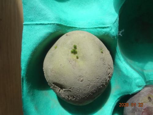 ジャガイモ、芽出し16日目の様子。リビングの窓際です。小さい芽が見えます。