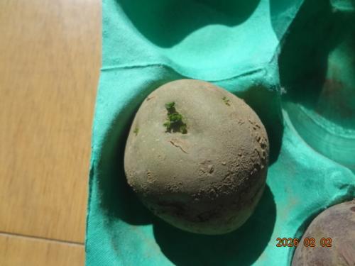 ジャガイモ、芽出し27日目の様子。リビングで日光浴、まもなく土に埋める予定です。