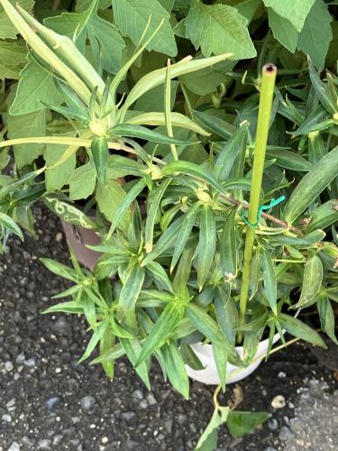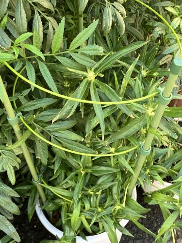 親株というか、元の株は葉先が縮れたり、肥料やけなどで?不調だが、こちらの挿し芽からの株はやや好調だ。用土や肥料がおそらく良い加減になっているものと思う。葉色は濃い緑色というわけでもないし、やはり縮れているところはある。きっと、(この植物は水枯れしたら致命的という情報に影響され)水やりを多めにしてるからもある。