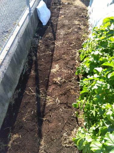 道路と借りているスペースの間にあるエリアにバーク堆肥をまきました。これだけのスペースに40リットル入一袋使いました。