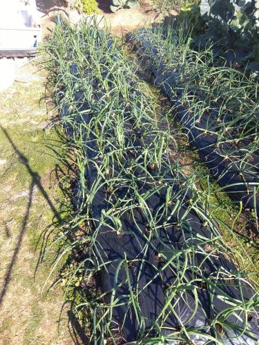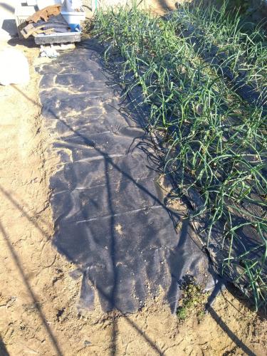 貸し農園の自分が借りているスペースの内側(通路側)は雑草がたくさん生えています。昨日のタマネギ追肥の写真左端が、まだまだ寒いのに、暖かくなれば一気に伸びて行くのだろう、雑草は準備万端なので、防草シートを敷きました。