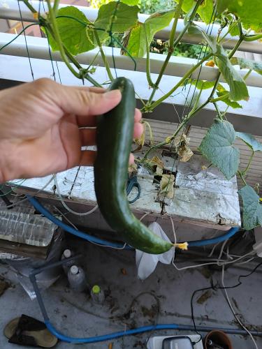 水耕栽培のキュウリを1つ収穫しました。 曲がっています。味は美味いです。 株に元気がありません。 隣のキングメルティーも不調です。