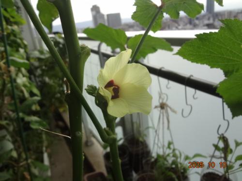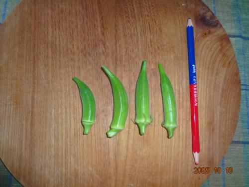 オクラ日記、4個収穫、累計109個。5輪開花。