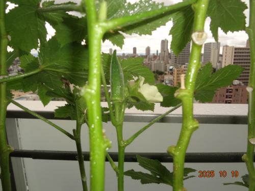 オクラ日記、2個収穫、累計134個。1輪開花。