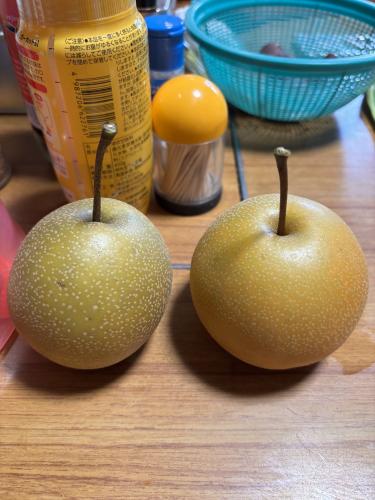 梨80個目 小さいが食べたら食べ頃だった。 来年は普通のサイズを目標。 大天理は激レア品種みたい。 大天理は収穫は晩成みたい。 2025年9月9日 大天理はサイズが大きい。