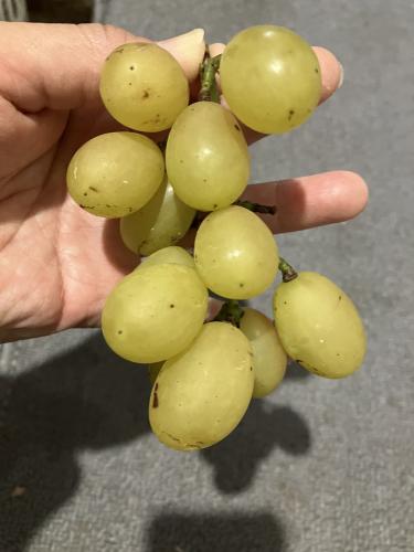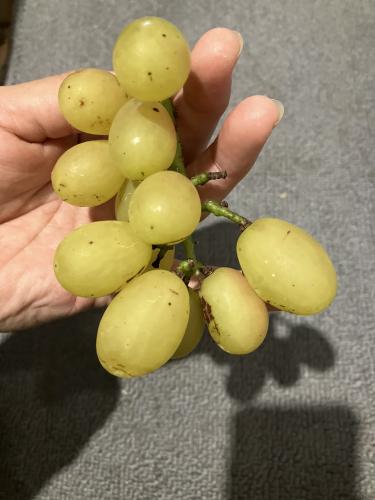 赤くはならなかったが、ついに収穫した。今年初なりで、まともなのはこのひと房だけ。しかも粒の数がかなり少ない。やはり枝葉の数が影響したとみえる。黒痘病にはならなかった。これは薬剤散布を割と励行できたことと袋に入れていたため。