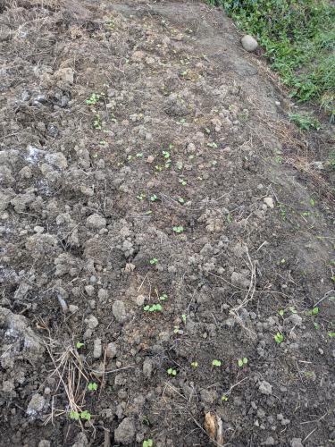 ばらまいたそばが芽が出てきた。 掘って本当にこんな土で栽培できるのか不安だったから少しほっとした… そりゃあ芽くらいでるか 苦笑