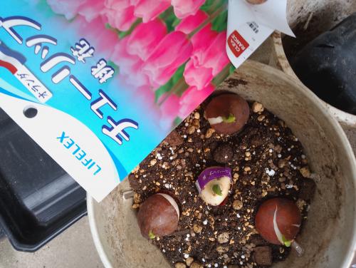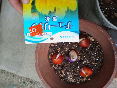 昨日コーナンにて、3球で税込み百円のごく一般的なチューリップの球根を買ってきた。花の色は赤色も売っていたが、今年は黄色、ピンク色にした。それと、ひとつ五十円の紫の球根も二つ買ってきて、(寄植えにしようと)鉢に植えた。土は再生土、よくある培養土、鹿沼土、洋ラン用の土、堆肥の等量混合が主体。少し有機石灰や化成肥料なども混ぜた。鉢は水はけの良さげなものを使った(素焼きと、いつものようにプラ鉢にハンダゴテで穴を開けたもの)。