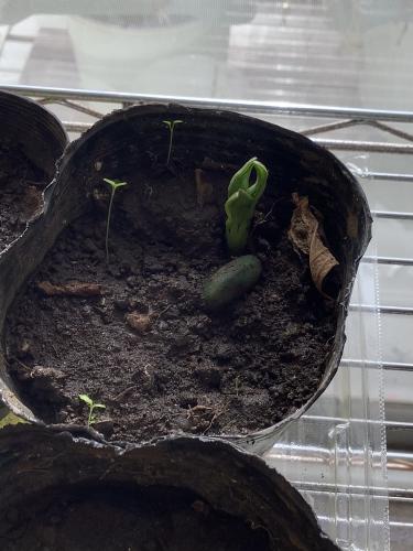 やっと、やっと、やっと発芽です! こんな時期に発芽してどうなってしまうのやら……… どうにか茎を支えて春まで頑張らなきゃ。 発芽はいまのところ1芽のみ。 他の4豆はシ〜ンと微動だにしていません。(-_-)zzz