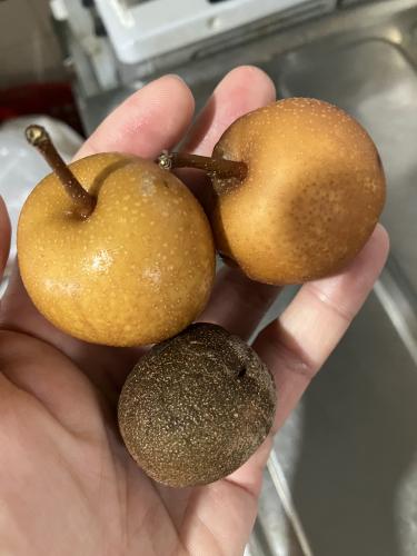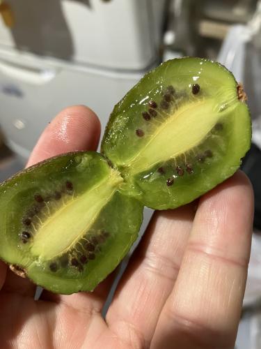 キウイが皆枯れかけてる。孫悟空の株から病気がうつったか、水やりを続けた結果土が硬くなりすぎて根腐れや酸欠になったかだろう。とにかく葉っぱが極端になくなった。 この果実はかなり小さいが、味はしっかりキウイの味になっていた。なぜかわからんが、完熟してる。しかも樹上で。 写真一枚目はこのキウイを切ったところ。写真ニ枚目は実生豊水のミニミニ果実と。どれも勝手に落ちてきたもの。