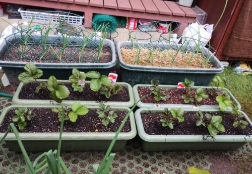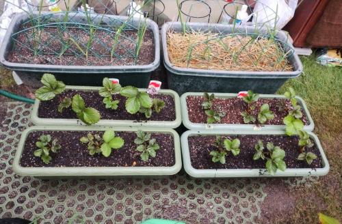 今年に苗取りした株を定植しました。 プランター4つで40Lの培養土2袋を使用。 元肥は牛糞を半握り、魚粉・鶏糞・骨粉を1摘みづつ穴設肥しました。