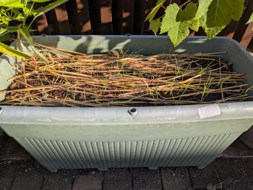 家の前で育苗中の玉葱の苗。 割と等間隔に伸びていて、乾燥にもやられていない様子…敷き藁と深型プランターだからかな? なんだけど、1cmよりは狭い間隔で植えたんだけど間引きもしてないのに既に2〜3cmくらいの株間。 …大事に育てるしかなさそうです