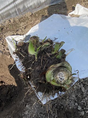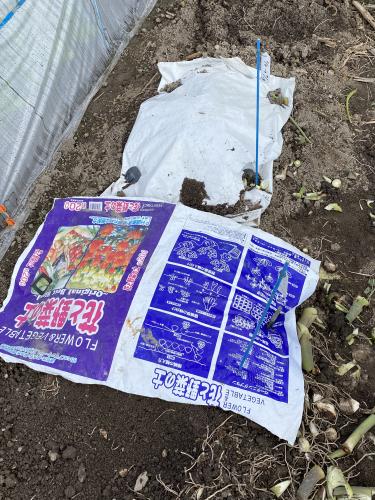 成長が早そうな二株の茎葉をカットし掘り上げて、 株の上下を逆さまにして40cm深さの穴に埋めました。 雨水対策のビニールで覆い2w熟成します。