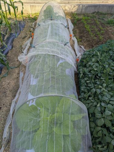 こっちも虫食いがあるけど少しマシな中手白菜。 こっちで葉に穴が空いた株からイモムシ引きずり出して違う世界に送ってあげたので少しスッキリ♪ マルチをめくって一つまみずつ化成肥料を追肥して、早生の白菜で余った農薬を防除でまいた。 こっちはこれからもっと枚数稼いでくれないとな。 大きくしないと。