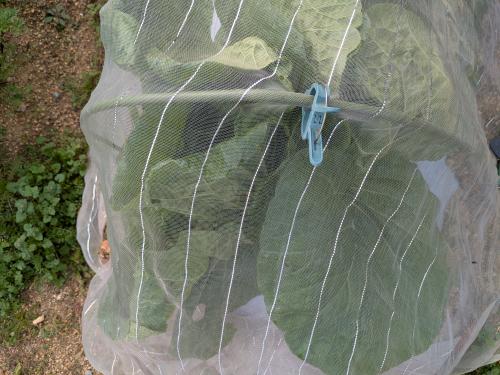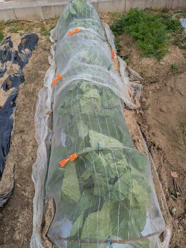 こちらの中手の白菜はネットの中ですが、外から見る限り悪くなさそう。 外葉が大きくてネット突き上げる勢いで大っきくなるので このまま虫食いもなくいってくれ…と願うばかり