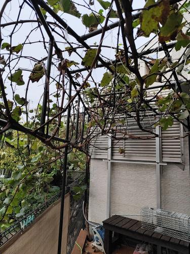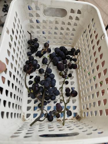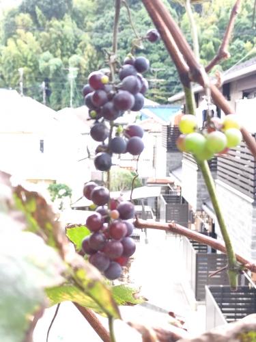 ナガノパープルの落葉が進み、勝手にできたぶどうが露わになってきました。 カラスに突かれてしまうので、小さいぶどうを回収しました。