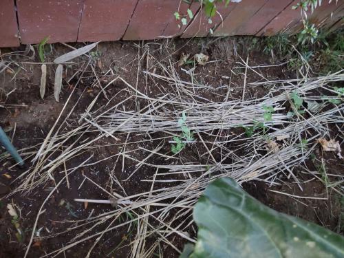 ブロッコリー の北側に苗を4本植え付けた。 ブロッコリーの葉っぱが大きく日陰になるので、少し葉っぱを切った。