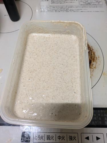 水とコーヒーミルと石臼で砕いた粉を少しずつ混ぜては…YouTubeほど泡は出なかったけど、カビずに出来たので採用