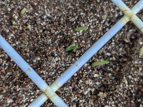 六条大麦が発芽しました。 去年はネズミだか鳥だかに荒らされてボロボロにされたので、今年は阻止せねば。来年の麦茶いっぱい作りたい! 上に載せてるネットを突き刺して芽が出る前に室内に入れようと思います。